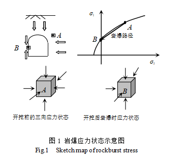 深部工程巖體的受力狀態十分復雜,未開挖的地下巖體為三向應力狀態,隨著洞室及巷道的開挖,巷道兩側表面圍巖為單向壓縮狀態,巷道表面頂板圍巖處于單向拉伸狀態,深部為三向應力狀態。當三向應力狀態的巖體因開挖而成為單向壓縮或雙向壓縮狀態過程時,可能發生巖爆,見圖1巖爆應力狀態示意圖。