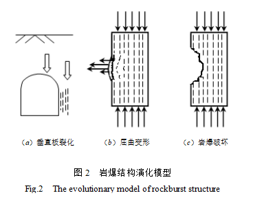 巖爆發生過程【27】可分為(a)垂直板裂化,(b)垂直板屈曲變形及(c)板變形增大破壞形成巖爆,見圖2巖爆過程。