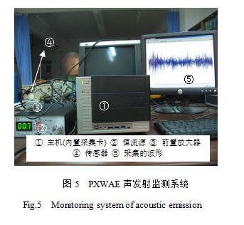聲發射采用PXWAE檢測系統,見圖5。該系統由主機(內置采集卡,最高采樣速度為20MHz)、恒流源、前置放大器、聲發射傳感器組成。實驗時采樣率為1M,采用的聲發射傳感器探頭靈敏度為150kHz。