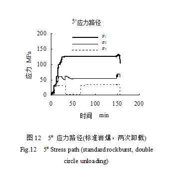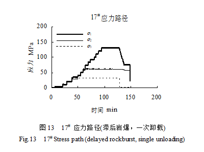 進行了10件卸載巖爆實驗,巖爆特征有所不同,依據卸載到發生巖爆的時間可以將巖爆分為瞬時巖爆、標準巖爆及滯后巖爆,參見5.7花崗巖巖爆破壞進程及巖爆類型。卸載巖爆實驗條件及結果列于表4。其中幾種典型的應力路徑(應力隨時間變化曲線)見圖8~13,瞬時巖爆有2#樣、19#樣為一次卸載、16#樣為兩次卸載和13#樣為多次卸載;5#樣為兩次卸載標準巖爆;17#樣為一次卸載滯后巖爆。