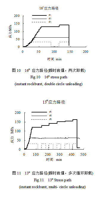 (3) 對某一試件,卸載后是否發生巖爆及何時發生巖爆與卸載前的應力狀態及卸載后其應力降速率有關。高應力狀態及高應力降速率的情況下易發生瞬時巖爆。