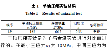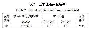 三軸壓縮實驗是為了與巖爆實驗進行對比而進行的。在最小主應力σ3為10MPa,中間主應力為20MPa時,最大主應力達到237MPa時破壞,破壞形式為單面剪切,見表2。