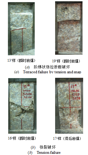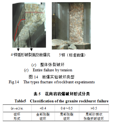 (6) 從花崗巖發生巖爆后的破壞形式來看,可以分為局部片狀及顆粒彈射的張裂破壞、局部顆粒及片狀彈射的階梯狀劈裂折斷和片狀及顆粒彈射的整體劈裂破壞。