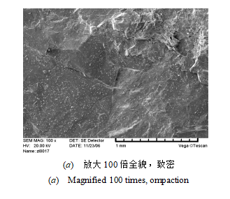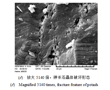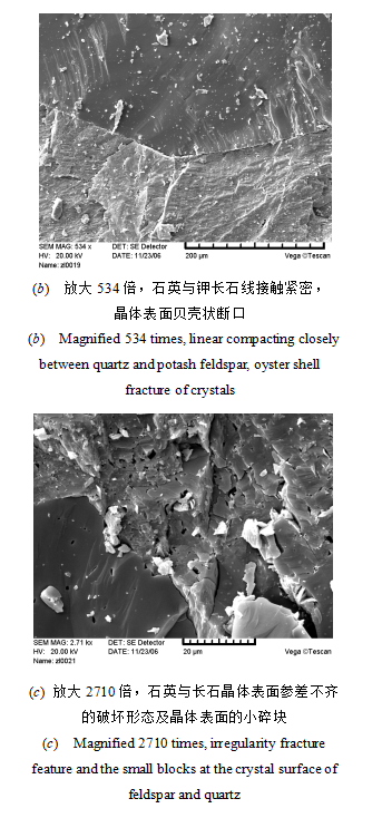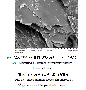 對破壞后的花崗巖碎塊進行電鏡掃描發現石英與長石晶體呈緊密線接觸,從破裂面上可見石英及長石晶體斷裂,晶體間云母片折斷,晶體斷裂的斷口呈不平整的階梯狀。見圖15破壞后5#花崗巖碎片電鏡掃描不同放大倍數下的(a)至(e)圖片。(a)放大100倍的電鏡掃描圖片全貌,致密,表面凸凹不平,不同礦物晶體緊密接觸。(b)為局部放大534倍后的石英與長石晶體緊密線接觸情況,并可見石英與長石斷裂的階梯形端口,晶體表面有小碎屑分布。(c)為局部放大2710倍時石英表面的斷口及長石晶體的參差不齊破壞狀態。(d)為放大5140倍之后更清晰的長石晶體斷裂形態。(e)為放大5300倍的粒間云母片及交錯不齊的斷裂形態。