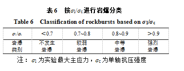 發生巖爆試件的σ1/σc值與其巖爆類型有一定的相關性。在所實驗的花崗巖試件中,該比值σ1/σc≥0.73時發生了不同類型的巖爆:滯后巖爆、標準巖爆或瞬時巖爆。表6列出了按σ1/σc進行的花崗巖巖爆分類。最大主應力值對應著巖爆發生的深度(在不考慮構造應力或其它因素的影響下)。在淺部應力較低的條件下,不發生巖爆;到達一定深度后,開挖引起的切向應力與巖石長期強度相當時,σ1/σc=0.7~0.8時發生較弱巖爆;隨著應力的增加,當最大主應力與巖石單軸抗壓強度σ1/σc=0.8~0.9時,發生中等強度巖爆;當最大主應力與單軸抗壓強度之比大于0.9時發生強烈巖爆。