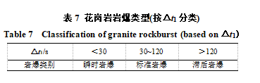 目前千米深度范圍內巷道等地下工程開挖后,受巖性結構、應力狀態及工程擾動等因素的作用影響,并不一定立即發生巖爆。根據在實驗室內卸載后至發生巖爆的時間△t1不同,可以將巖爆類型分為瞬時巖爆、標準巖爆及滯后巖爆,見表7。