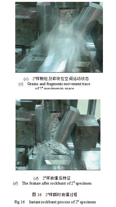 (1) 瞬時巖爆是指發生巖爆進程快,在巷道開挖后會立即發生巖爆。很難進行各個階段的明顯區分。圖16是2#樣卸載瞬間就發生了巖爆的情況。卸載時垂直最大主應力高于巖石的單軸抗壓強度,最大主應力差σ1-σ3=σ1,σ1/σc=1.24,卸載0.5s瞬間發生巖爆。瞬時巖爆一般對應著工程進入深部之后,原巖應力或開挖后引起的切向集中應力與巖石的單軸抗壓強度比值較高的條件下發生的。