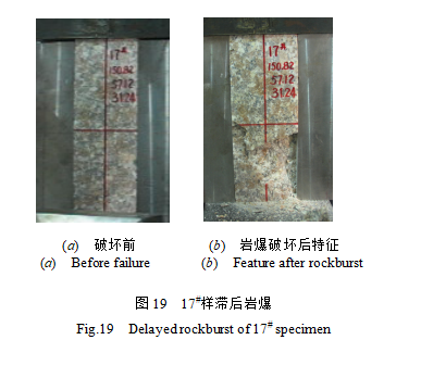 (1)滯后巖爆是指卸載后發生巖爆時間比標準巖爆更長。發生滯后巖爆有兩種情況,一是巖體在一定載荷作用下,隨著時間的增加,受長期強度控制下具備巖爆發生條件時,二是地下巖體卸載后應力重分布達到新的平衡狀態過程中,發生的巖爆破壞。滯后巖爆的室內實現可以在三向應力狀態下,最大主應力小于巖石的單軸抗壓強度時進行卸載巖爆實驗或加載巖爆實驗,一般卸載后需要較長時間才發生巖爆,即滯后巖爆。大量蠕變實驗表明【28】,巖體的長期強度低于單軸抗壓強度,并且隨著時間的增加,長期強度降低。圖19是17#樣滯后巖爆的卸載后破壞前及巖爆后特征,卸載后在開始5分鐘內可以聽到試件的聲音,表明裂紋開裂,巖石損傷加劇。5~20分鐘為平靜期,但試件內的應力在調整過程中,形成局部最后的劣化破壞區,20分鐘時突然巖爆,顆粒及小碎塊彈射。