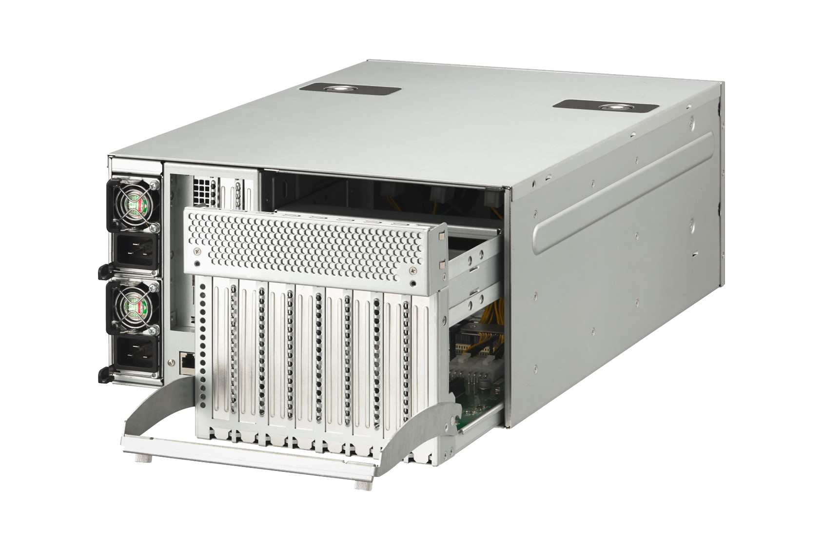 機(jī)箱采用抽屜式結(jié)構(gòu),抽屜內(nèi)可以安裝4塊雙寬270mm長(zhǎng)度的GPU,(比如A100 V100)等專業(yè)GPU。這是安裝了4塊A100 GPU的照片