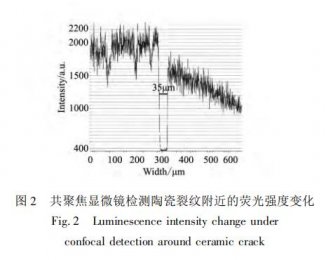 (1)陶瓷在加載開裂后,受預(yù)緊力一側(cè)熒光強(qiáng)度幾乎沒有變化,受疲勞載荷一側(cè)熒光強(qiáng)度明顯改變,從裂紋邊緣向試樣外邊緣逐漸減小,沿著裂紋縱向方向,從裂紋初始位置至尖端,熒光強(qiáng)度呈區(qū)域性增長;
