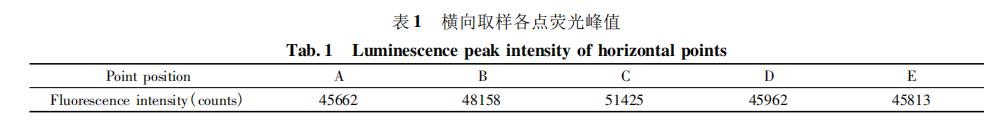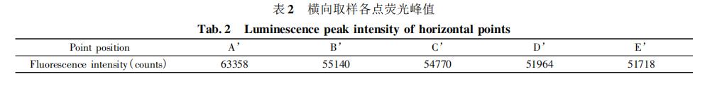 為了找出熒光強(qiáng)度變化的規(guī)律,分別沿著裂紋縱向和橫向取點。取量子點環(huán)氧樹脂膜受預(yù)緊力一側(cè)兩點 D、E,其中 D 點為裂紋邊緣,取受疲勞載荷一側(cè)三點C、B、A,其中 C 點為裂紋邊緣,B 點在 A 點和 C 點之間。對其五個點進(jìn)行測試,各點光譜圖如圖 4,量子點熒光峰值如表 1,可見受預(yù)緊力一側(cè)無明顯熒光增強(qiáng),D、E 兩點峰值相差 149,而受疲勞載荷一側(cè)有明顯熒光增強(qiáng),C-B、B-A 點之間峰值依次遞減 3267 和 2496。