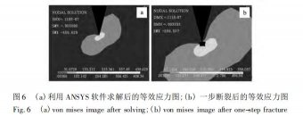 由圖 6a 可知在初始裂紋尖端處,等效應(yīng)力達(dá)最大值;因此裂紋擴(kuò)展首先從此處發(fā)生,利用 ANSYS 中的殺死/激活命令實現(xiàn)試樣斷裂一步的模擬。為判斷裂紋下一步的擴(kuò)展方向,在殺死第一個單元的條件下再執(zhí)行求解操作,然后用選擇功能將非激活單元選出選擇集。試樣斷裂一步后的 Von Mises 等效應(yīng)力如圖 6b,依此分析方法,得到如圖 7 所示的斷裂八十步后的 Von Mises 等效應(yīng)力分布圖。