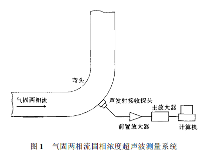 在粉管的彎頭管壁外側安裝超聲波接收器 , 超聲波接收器和管壁之間采用耦合劑進行耦合, 可以測量不同固體濃度下顆粒撞擊到彎頭壁面上發出的超聲波信號,該信號通過增益器進行放大,再通過數據采集器送入計算機 ,由計算機對采集獲得的超聲波信號進行參數分析,或通過頻譜分析和小波分析等手段獲得超聲波信號的特征 ,從而反推即可獲得固體顆粒的濃度。