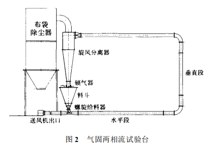 氣固兩相流試驗臺如圖 2 所示 ,主要由高壓風機、螺旋給粉機 、風管 、旋風分離器 、料斗 、鎖氣器、布袋除塵器等組成。系統給粉量由調速電機控制, 最大給粉量為(2 ~ 3)t /h 。粉管內徑為 150 mm , 水平段長度為5 m ,垂直段長度為 3 m 。水平段與垂直段之間的彎頭彎曲半徑 R =150 mm ,管壁厚度 4. 5 mm 。
