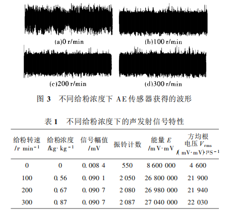 圖 3 給出了不同給粉機轉速下通過聲發射接收器獲得的信號波形。由圖可見 , 聲發射信號屬于連續型信號, 隨給粉濃度的增加 ,信號波形變得非常密集 , 說明固相顆粒撞擊管壁的頻率隨固相濃度的增加而迅速增加。由于信號波形非常密集 ,基本無法根據肉眼分辨信號波形 ,需要采用頻譜或小波等信號分析手段才能獲得比較直觀的波形分析圖 , 但采用頻譜分析或小波分析耗時較多, 比較適合事后的細致分析。為便于現場在線應用,本文利用聲發射信號參數分析方法[ 6],采用幅值 、振鈴計數、能量、方均根電壓等參數對不同給粉濃度下的信號進行了分析 ,分析結果見表 1 。表 1中給粉濃度采用等速取樣標定獲得。由表 1 可見 , 聲發射接收系統對氣固兩相流中是否帶粉非常敏感 , 表現為信號幅值、能量和方均根電壓等參數都有數量級上的差距。